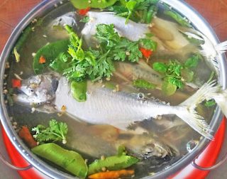 Prawns and (bamboo shoots/ mixed vegetables) in Thai sour and spicy curry with tamarind paste